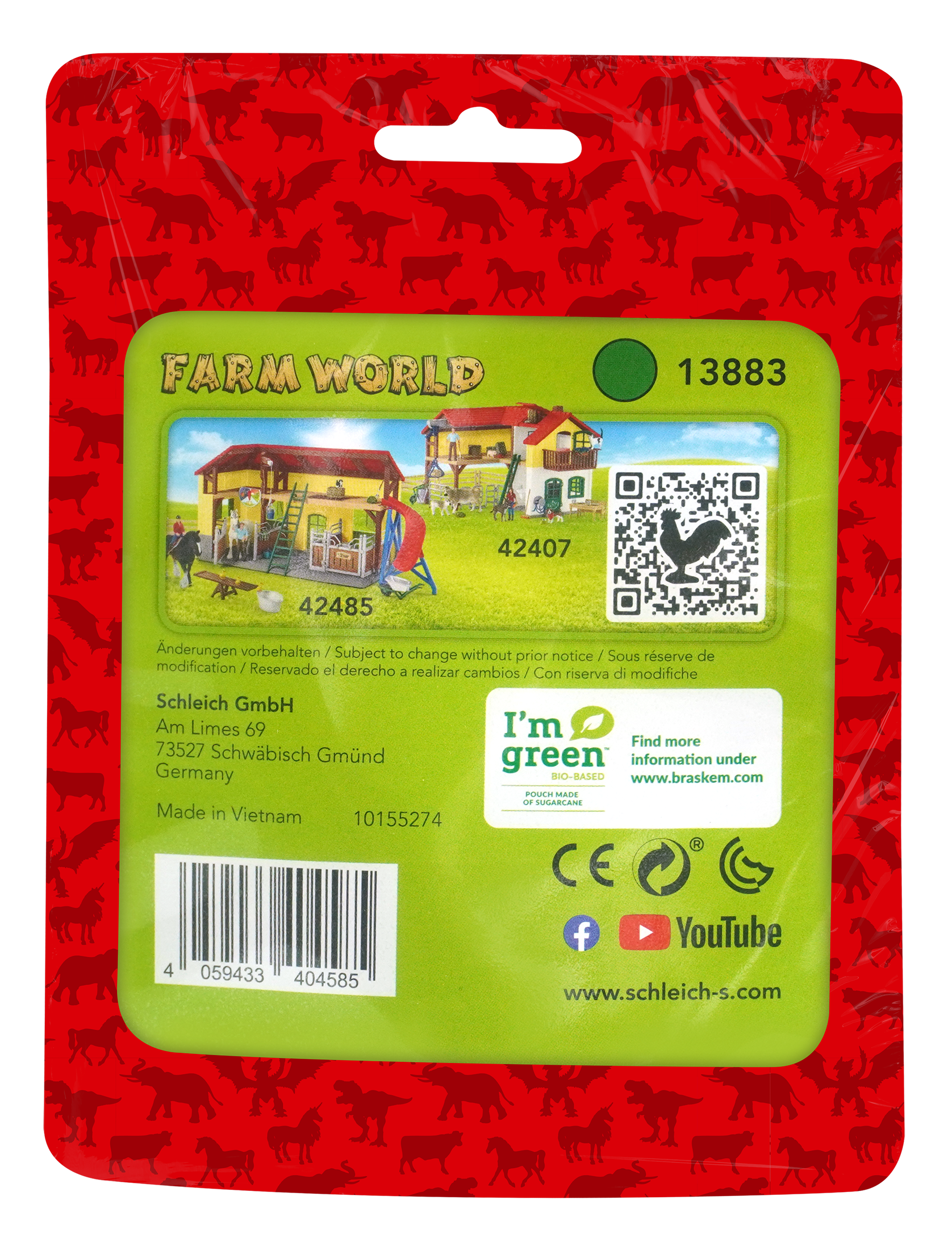 To nowa seria produktów Schleich - Red. Figurka, której numer oznaczony jest dodatkowo literą S, znajduje się w półprzezroczystej saszetce, z pięknym zadrukowanym tłem nawiązującym do serii, z której pochodzi produkt. W tym wypadku to seria Farm World. Produkt wraz z saszetką stanowią spójny zestaw, który stanowić może doskonałą formę prezentu.