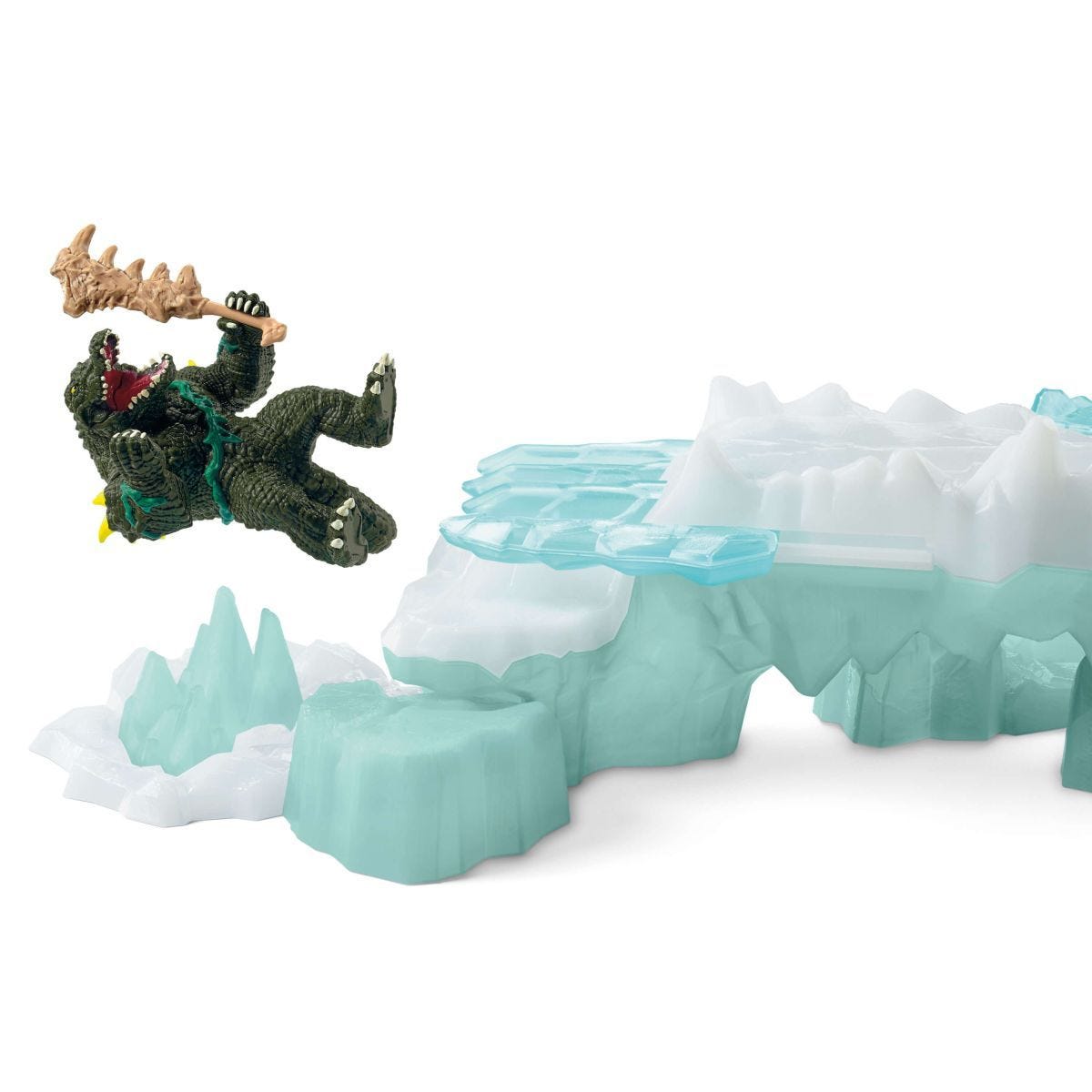Atak na twierdzę lodową z serii Schleich® Eldrador® Creatures kryje jednak i przed krokodylem liczne niebezpieczeństwa, mimo jego ruchomych łap i broni kostnej. Napastnik musi uważać, by nie wpaść w jedną z licznych zasadzek, gdyż droga do zdobycia superbroni najeżona jest niebezpieczeństwami i podstępnymi pułapkami. Uruchamiając zasadzkę z kolcami lodowymi czy doskonale zbudowany most zwodzony, wojowniczy krokodyl wyląduje w lodowatej wodzie; jeśli będzie miał pecha, drogę zagrodzi mu także przesuwna krata z kolców lodowych. We wnętrzu twierdzy lodowej musi jeszcze pokonać potężnego tygrysa szablozębnego, który ze wszystkich sił broni tajemnego schowka z superbronią. Kto wygra ten pojedynek? Dżungla czy lód?
