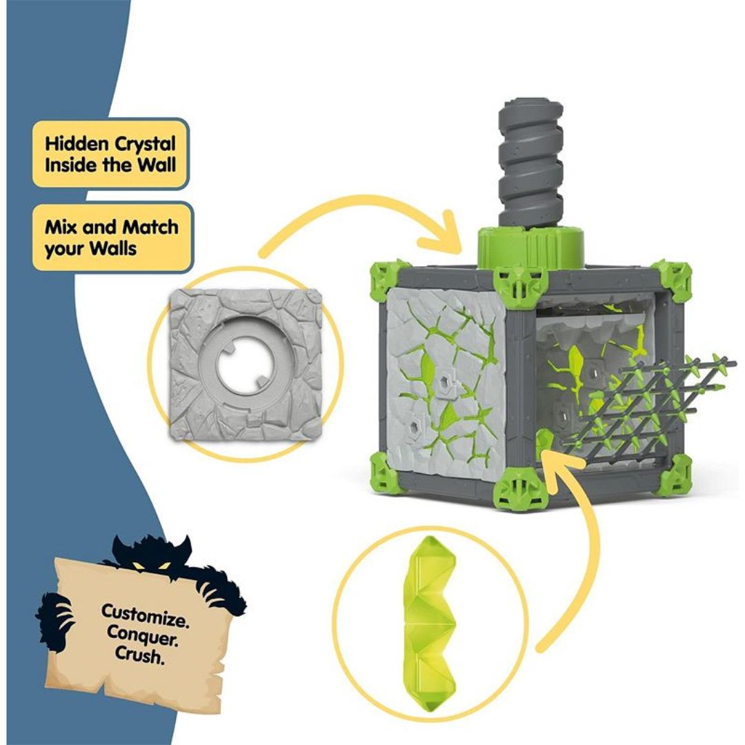 Potężny, nieruchomy jak skała, imponujący Kamienny Miażdżyciel czeka na przeciwników. Stoi zupełnie nieruchomo przed BattleCave, ale nic nie umknie jego bystrym, zielonym oczom. Jeśli spróbujesz ukraść kryształ świata z BattleCave, lepiej uważaj! Kamienny Miażdżyciel z prędkością błyskawicy wymachuje potężną kryształową pięścią, miażdżąc napastników. Nawet jeśli komuś uda się przejść obok kolosa niezauważonym, to jeszcze daleka droga do sukcesu. Intruzi muszą pokonać niebezpieczną zapadnię. Jednak gdy tylko docierają do BattleCave, pułapka zatrzaskuje się i zostają schwytani. Jakby tego było mało, Kamienny Miażdżyciel może również przykręcać ogromną śrubę! Sufit jest coraz bliżej. Czy napastnicy zostaną zmiażdżeni? BattleCaves z serii ELDRADOR® CREATURES zmienią dziecięcy pokój w miejsce akcji! Kto chce podjąć wyzwanie? Wszystkie BattleCaves można ze sobą łączyć. Na atakujących czekają podstępne pułapki. Spotykają się na pojedynek na Arenie Bitewnej. Co za walka!