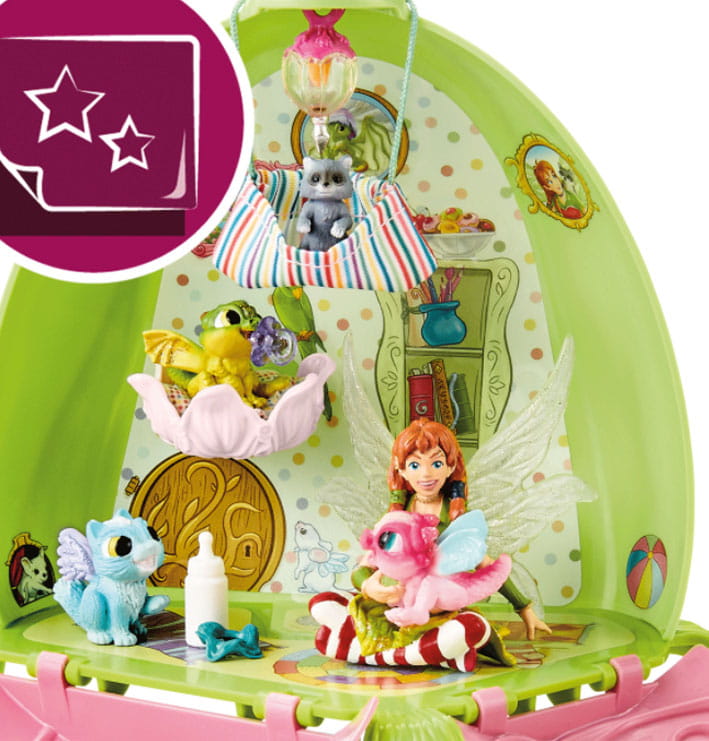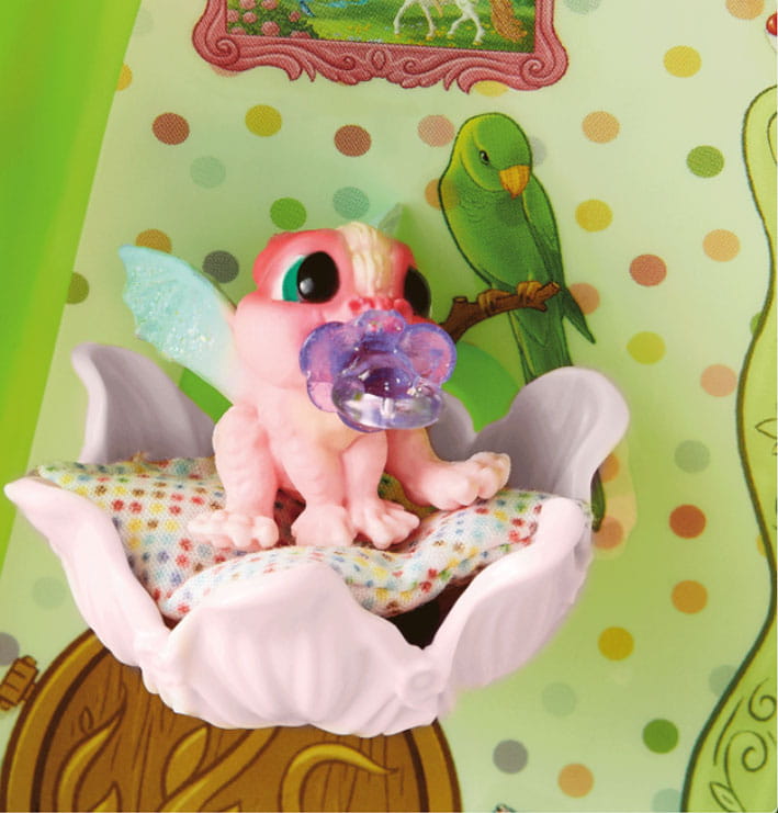 1x kwiat, 1x Marween, 1x smocze dziecko różowe, 1x smocze dziecko zielone, 1x skrzydlaty kotek, 1x Piuh, 1x huśtawka, 1x koszyczek, 1x smoczek, 1x zabawka, 1x buteleczka, 1x poduszka, 1x naklejka