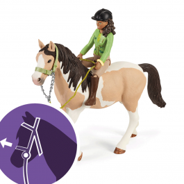 Wyjazd Sary na kemping z klubu jeździeckiego z serii Schleich® Horse Club sprawia jej oraz klaczy pinto wielką frajdę dzięki licznym akcesoriom, jak rozkładany namiot z naklejkami oraz słodki koń do przytulania.