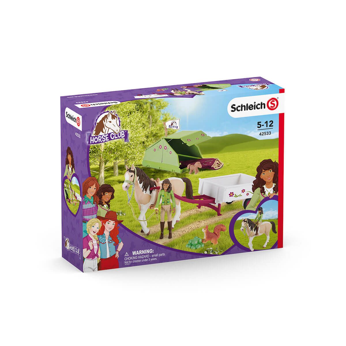 Podczas wyprawy kempingowej Sary z Horse Club z serii Schleich® Horse Club całkowicie ruchoma figurka Sary przywiązuje swą klacz pinto do przyczepy, do której załadowuje składany namiot i prowiant. Potem wkłada kask na głowę i chwyta kantar stajenny. Wio! Po przybyciu na miejsce cętkowany koń zostanie nagrodzony pysznymi zielonymi jabłkami za ciągnięcie przyczepy. Na koniec Sarah rozkłada namiot, wyciąga milutki śpiwór i wkłada do niego słodkiego konia przytulankę. Wiewiórka przygląda się z zainteresowaniem, jak Sarah przed pójściem spać wciąga na maszt tajemną flagę klubu jeździeckiego!